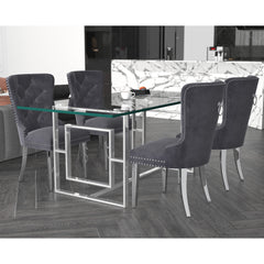 Elevate your dining space with the contemporary Adonis/Haven Five-Piece Dining Set, a perfect blend of style and functionality. This elegant set features a stunning table with a 12mm clear tempered glass top and a modern geometric lattice design on the sides. The polished silver finish on the stainless steel frame adds a touch of sophistication.