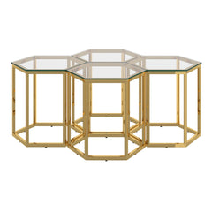 Featuring clear, tempered 8mm thick glass tops and a fun geometric shaped frame in a polished gold finish, each table exudes a touch of sophistication while maintaining a sleek and modern aesthetic.