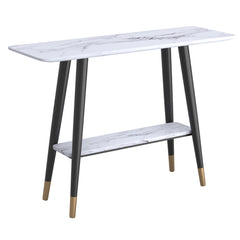 Elevate your entryway or living space with the Echo Two-Tier Console Table, a stunning fusion of contemporary style and versatile functionality. This elegant piece features a 1-inch thick reverse bevelled table top and a lower shelf, both crafted from engineered wood with a luxurious faux marble laminate veneer finish.