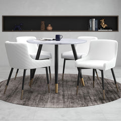 The set includes four modern dining chairs that complement the table's style perfectly. These chairs boast faux leather upholstery with eye-catching diamond-patterned stitching details on the seat and back. Supportive black metal legs with aged gold-dipped accents mirror the table's design, while medium-firm polyester foam cushions offer exceptional comfort during extended meals or gatherings.
