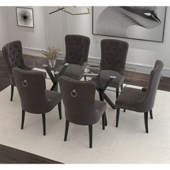 Complementing the table are six stylish side chairs that exude sophistication. The grey velvet upholstery with button-tufted details and chrome nail head accents create a rich, textured look, while the firm polyester foam cushions offer exceptional comfort. Solid rubberwood legs in a warm coffee finish complete the chic design.