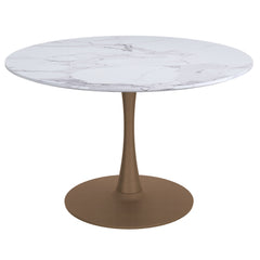 Elevate your dining experience with the Zircon 48" Round Pedestal Dining Table. This contemporary style table features a 1-inch thick reverse beveled table top made of engineered wood with a laminated veneer in a stunning faux marble finish. The sturdy metal base in a matte aged gold finish adds a touch of mid-century charm, while the clean lines and curves create a modern, stylish look.